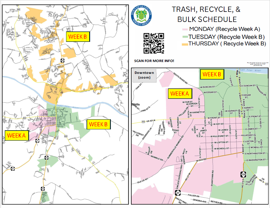 The Town of Lillington’s Public Works Department provides sanitation services to residents and businesses within city limits under the authority of NC General Statute 160A-174 and Chapter 50 of the Lillington Code of Ordinances. Lillington Public Works Department provides weekly yard waste and bulky item pickup, and has contracted with Carolina Trash and Septic (CTS) to provide weekly trash and recycling services in town. Please see below for more information on acceptable/unacceptable waste, guidelines, and schedules.