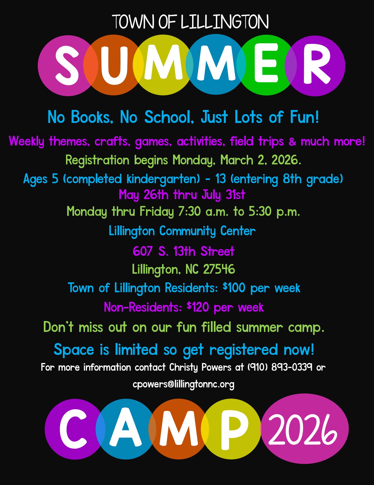 If interested, please complete the Summer Camp Application. Any questions can be directed to Christy Powers at 910-893-0339 or cpowers@lillingtonnc.org.